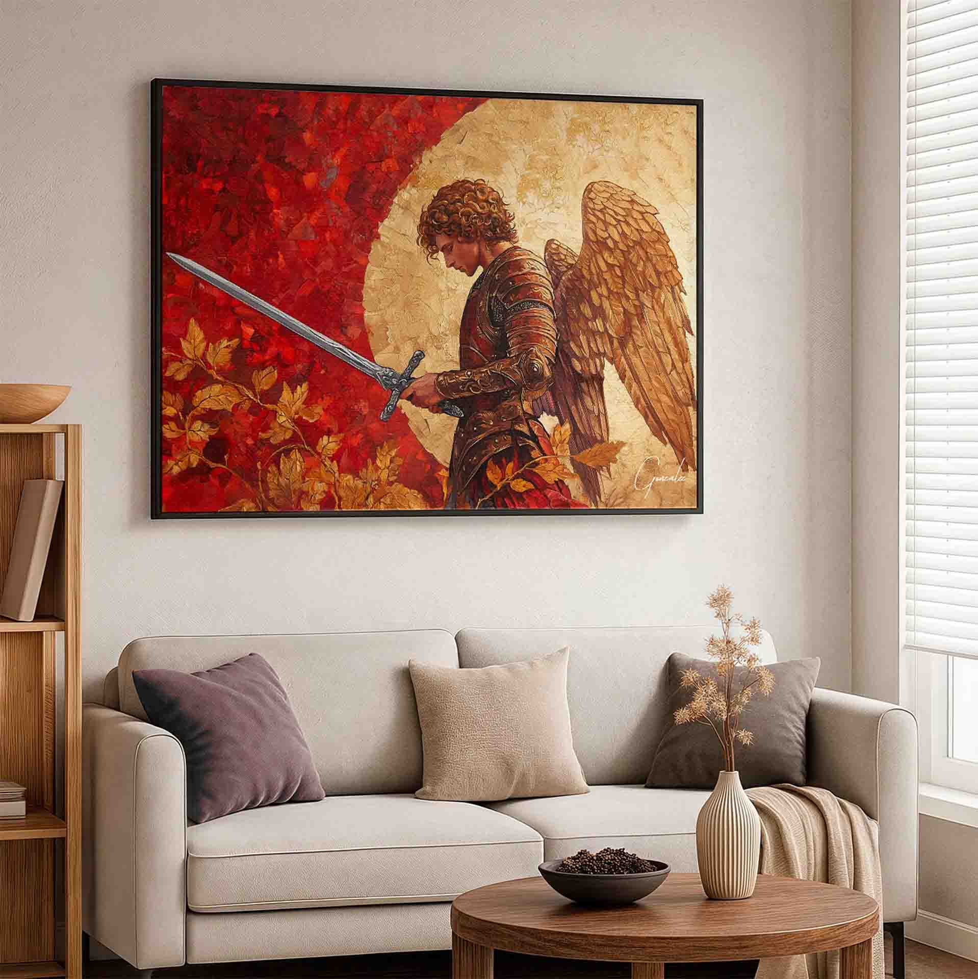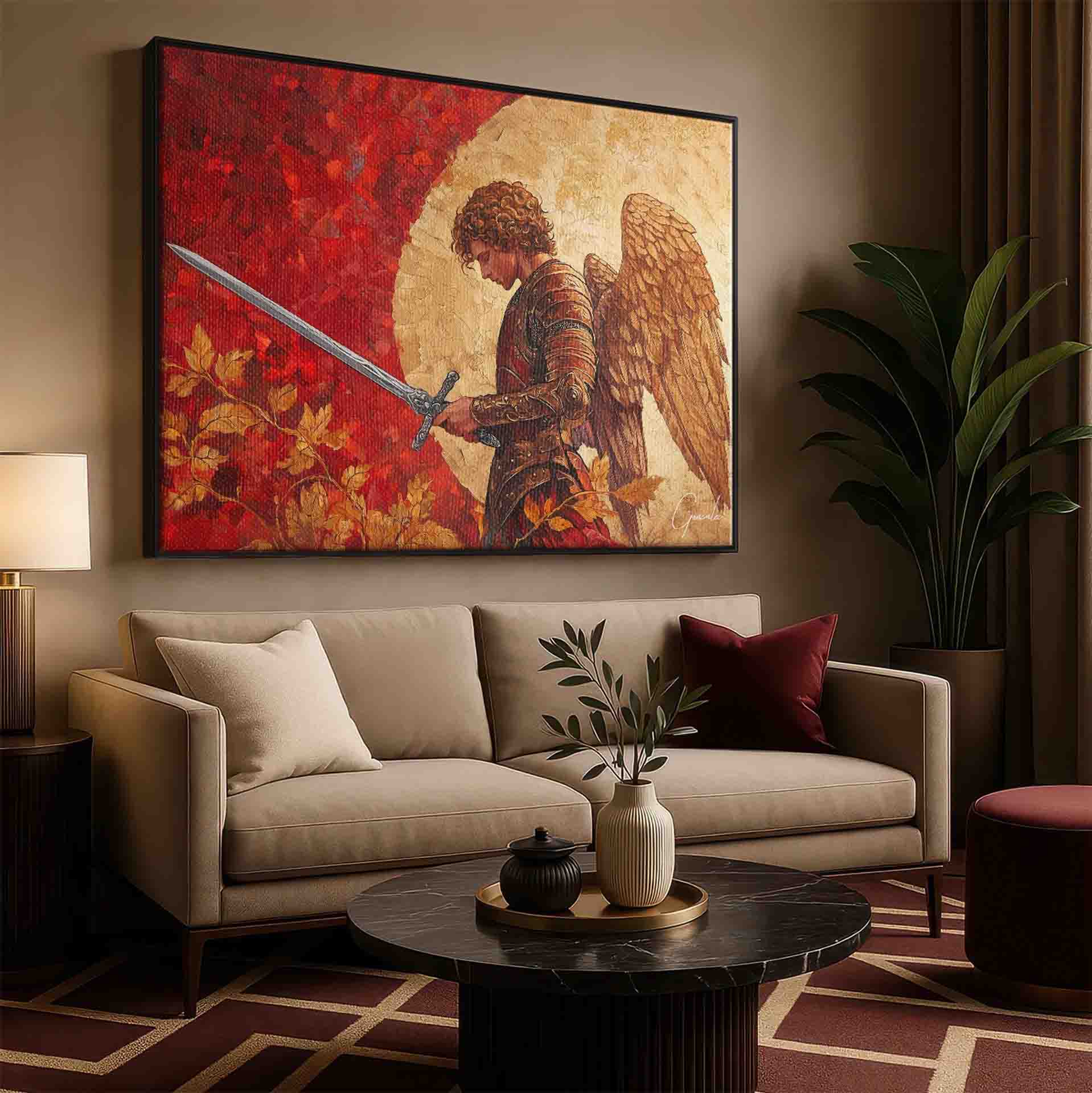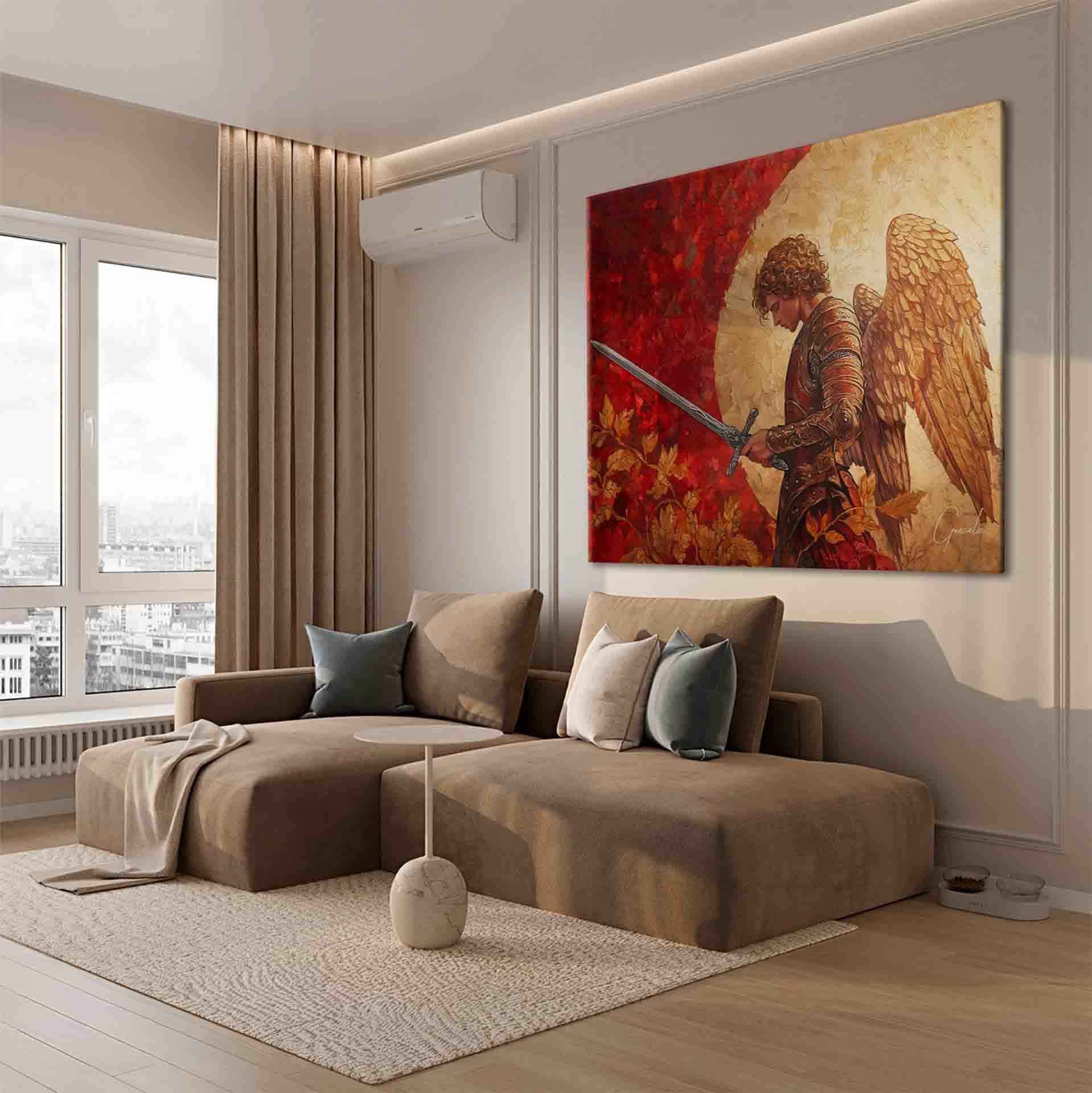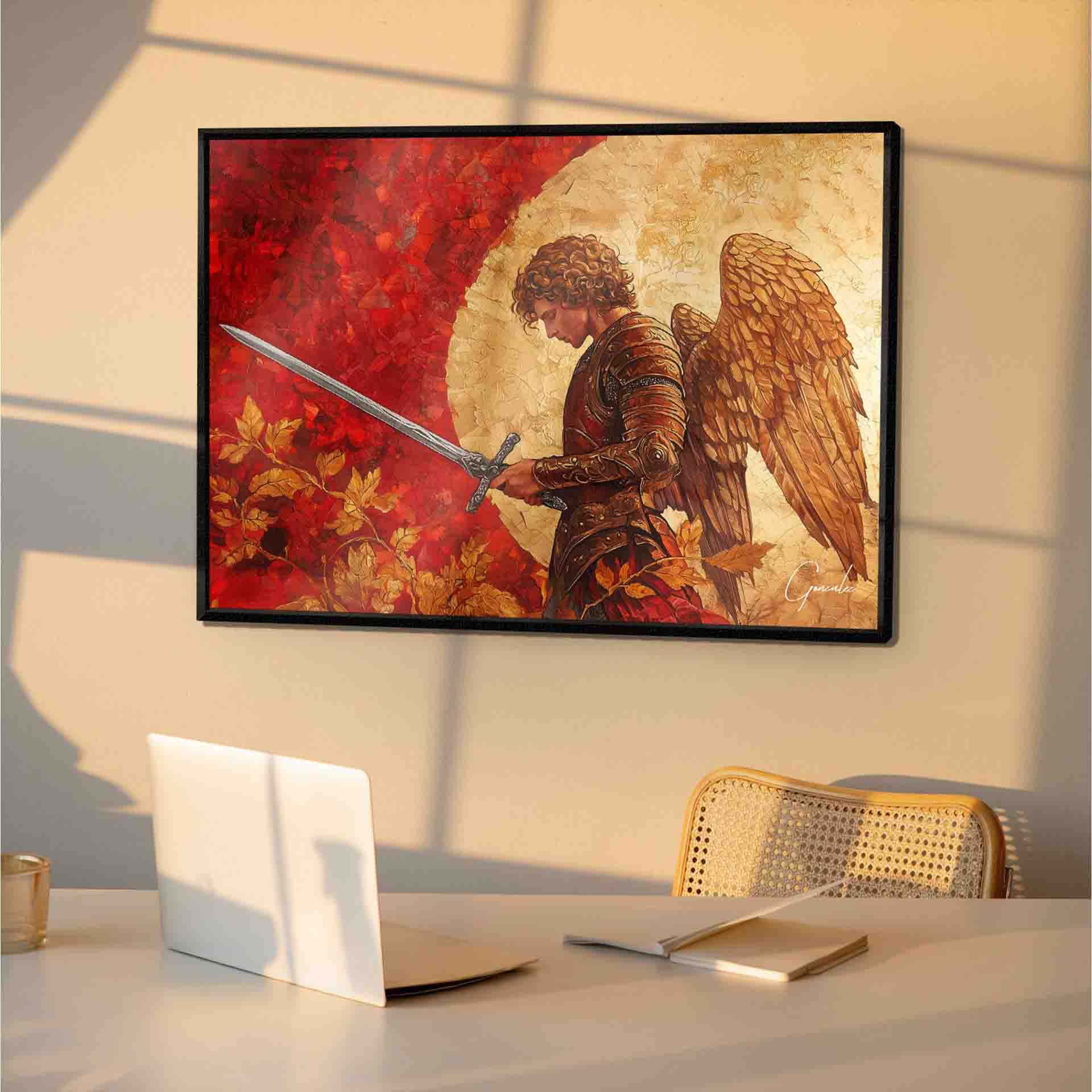 The artwork conveys a powerful sense of protection and courage, making it ideal for those who seek inspiration and spiritual strength within their home. A piece that transcends aesthetic beauty, carrying a profound message of protection and spiritual renewal.
