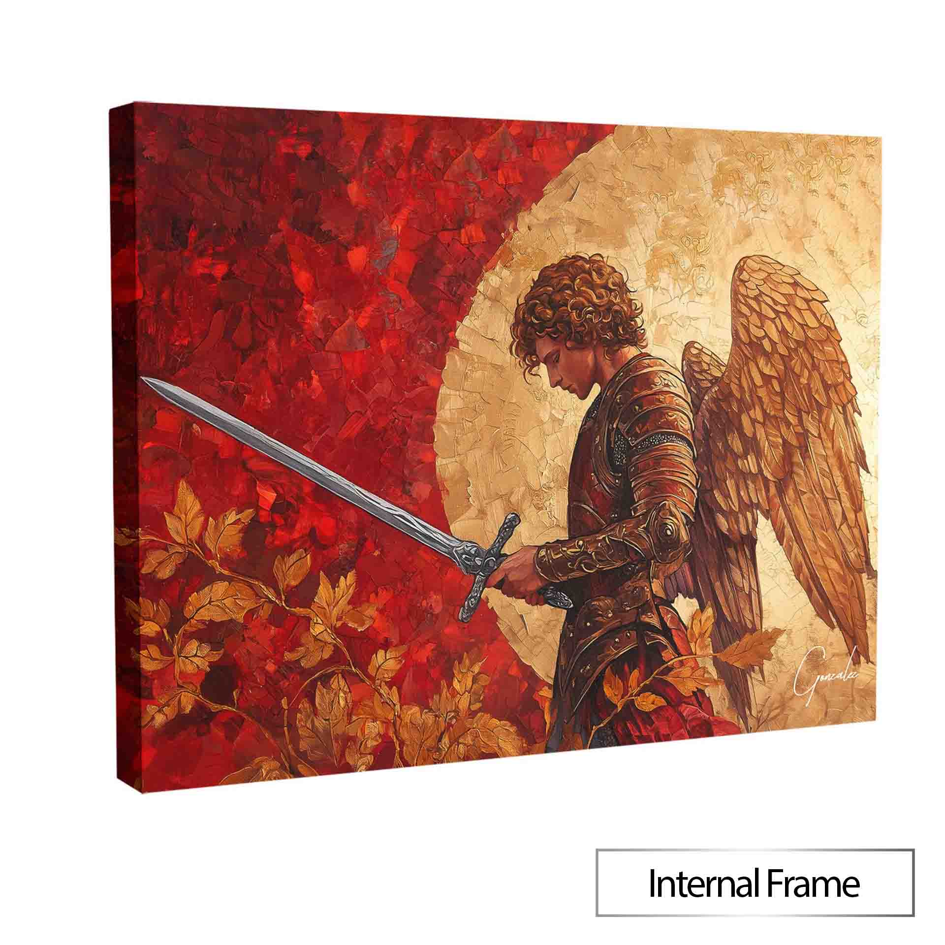 Clad in an imposing golden armor adorned with red details, Saint Michael is portrayed in a moment of introspection and preparation, his gaze fixed upon his sword. The vibrant background, combining the glow of a golden sun with intense red foliage, adds depth and movement to the scene, harmoniously contrasting with the armor and further emphasizing the archangel’s commanding presence.