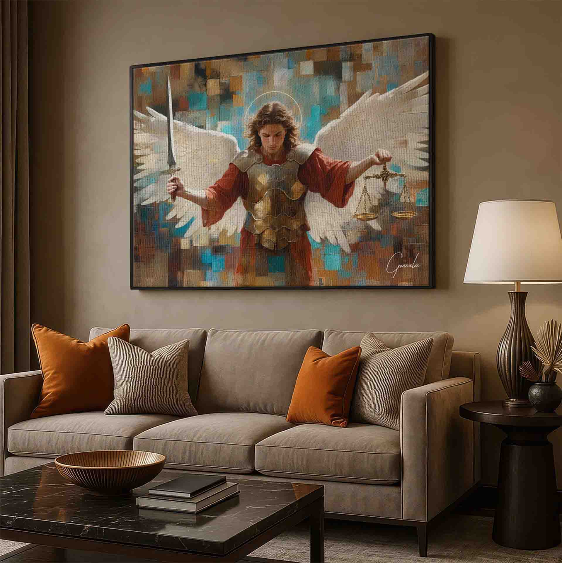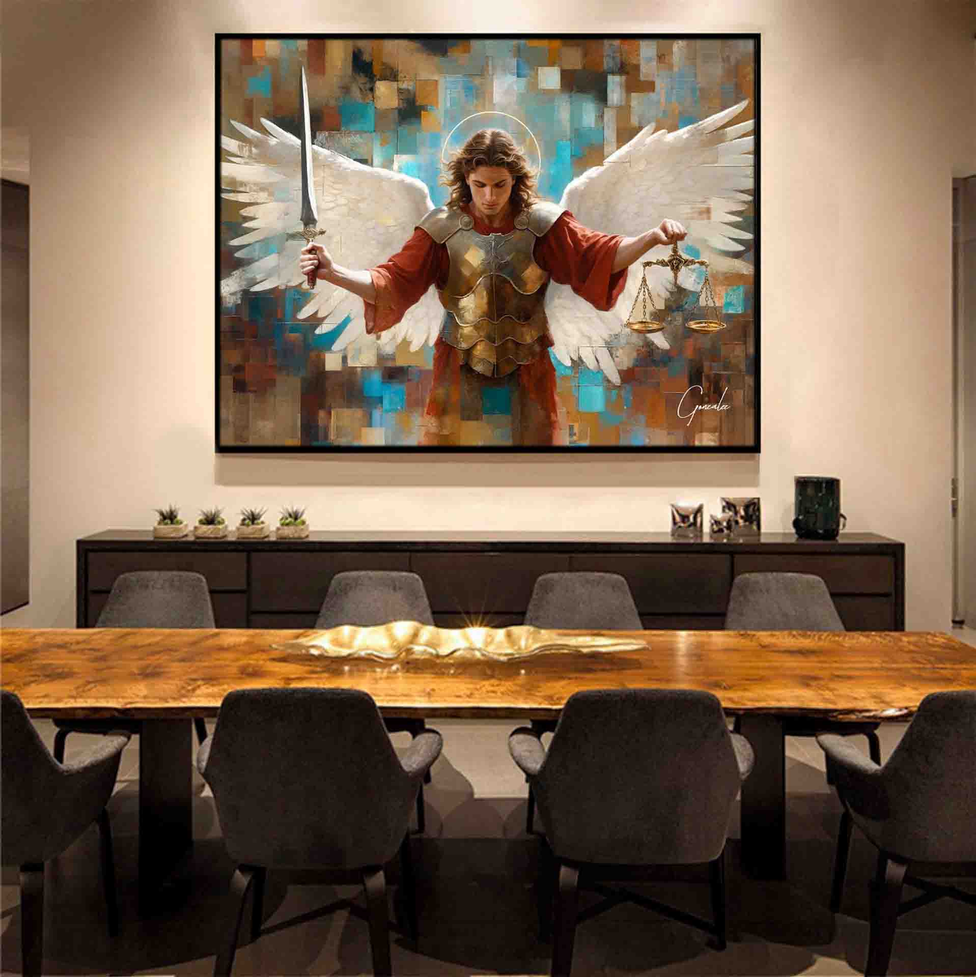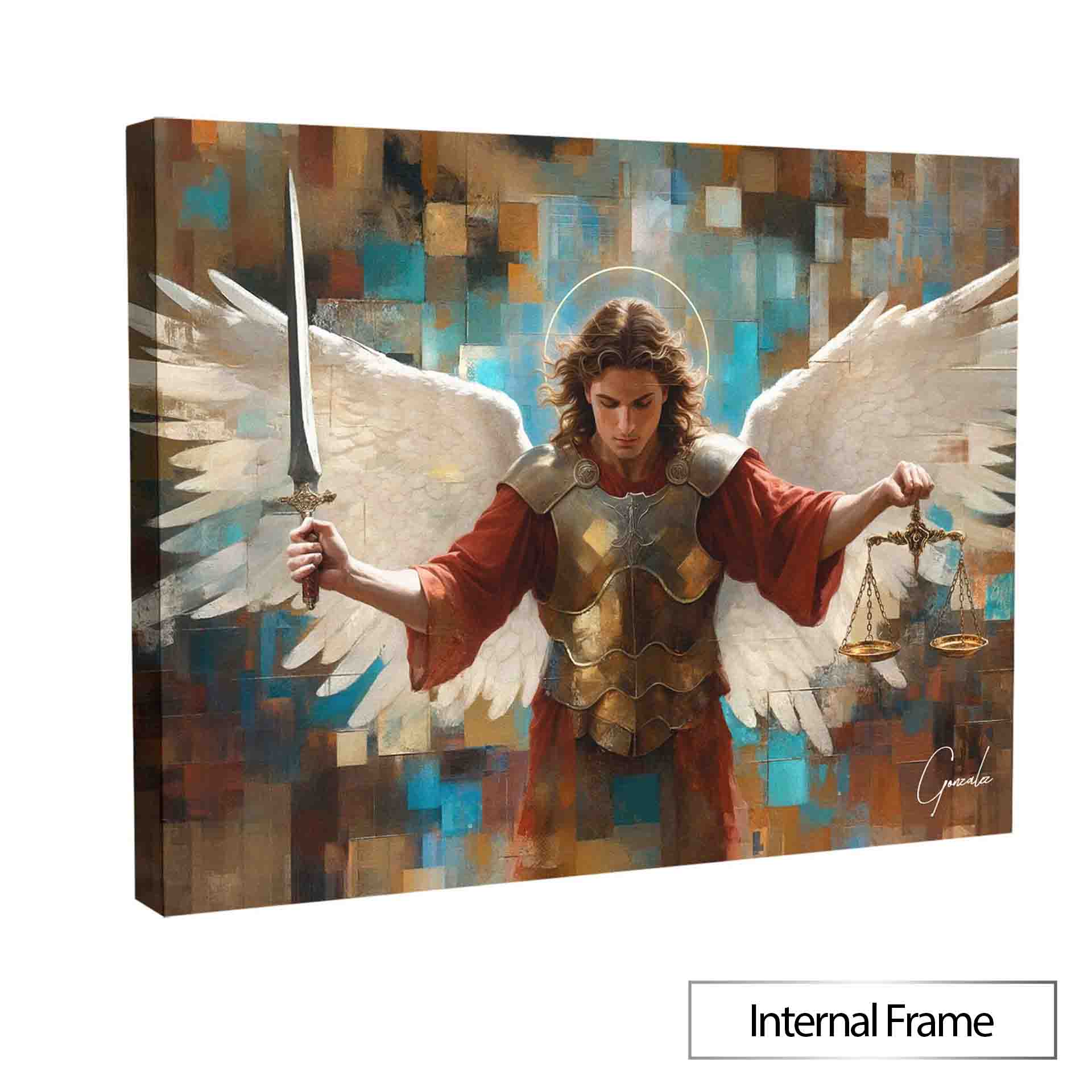 This striking piece portrays Saint Michael holding his sword and scales, ready for the spiritual battle, while his wings extend powerfully behind him. What makes this artwork truly unique is the Grid Art style, where the image is formed through geometric square elements, creating a structure that symbolizes divine order and the justice Saint Michael represents.