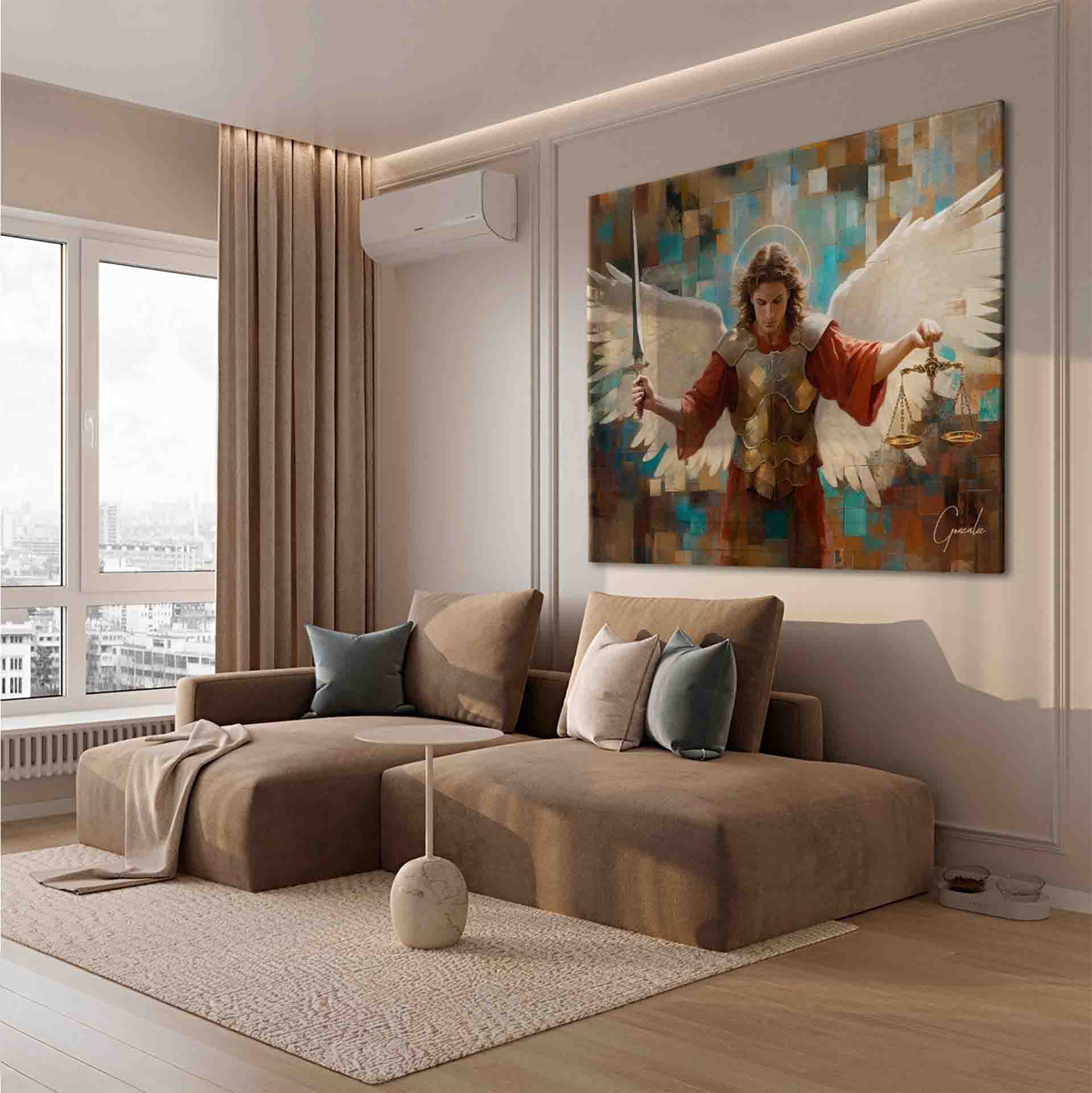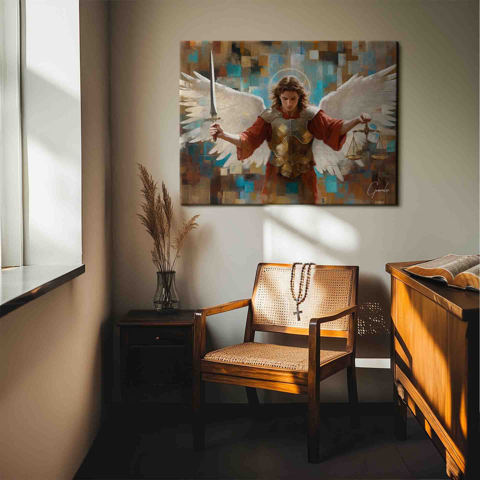Each square contributes to a composition that is both modern and deeply spiritual, reflecting the eternal struggle between good and evil. This artwork is more than a decorative piece; it is a powerful symbol of protection and faith, ideal for those seeking to create an atmosphere of peace and spirituality within their home.