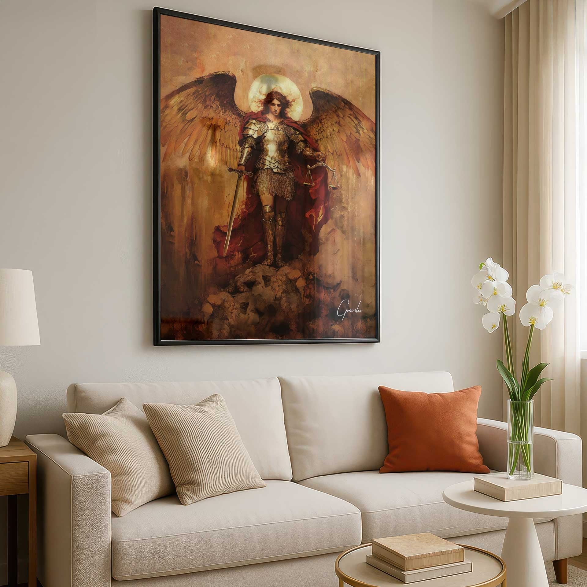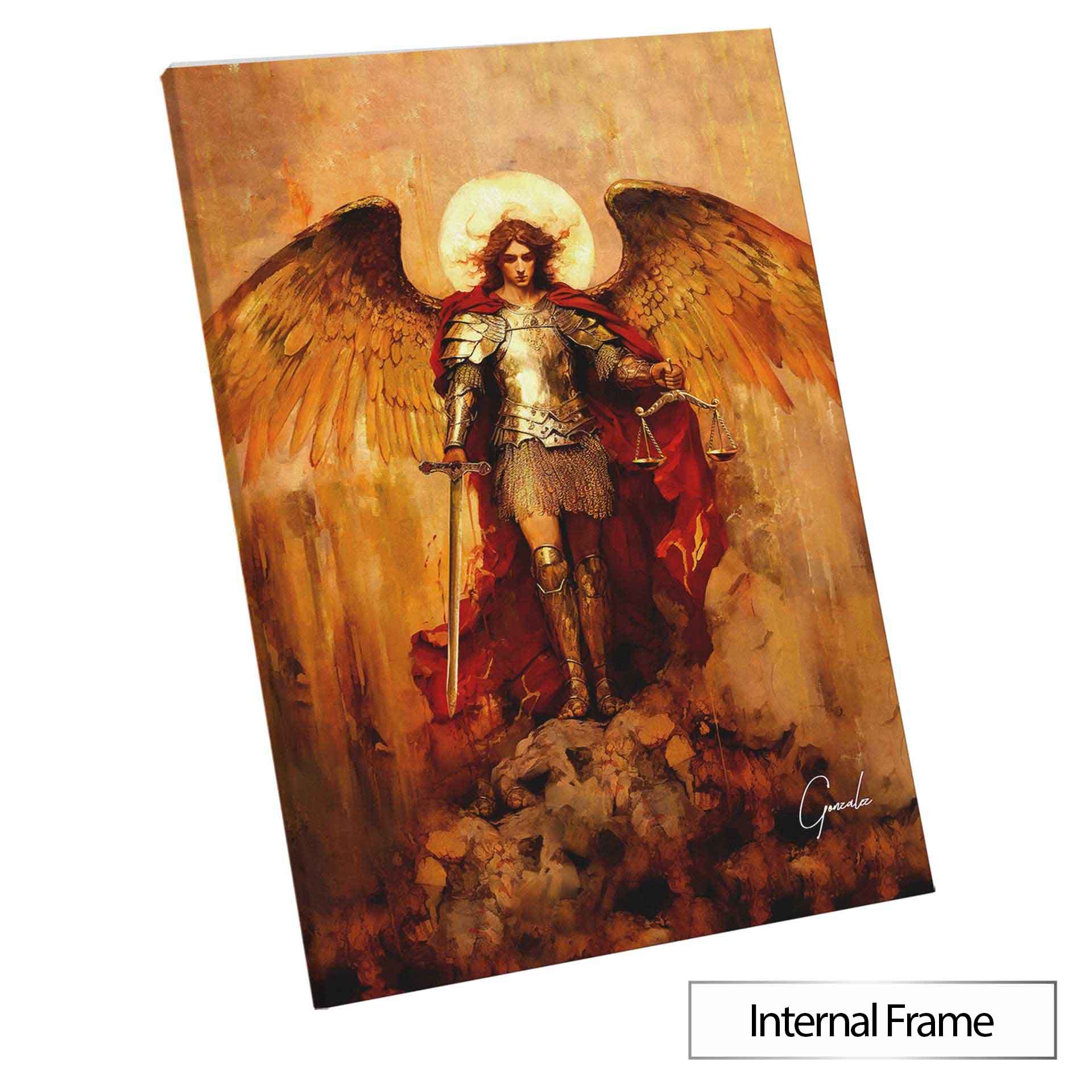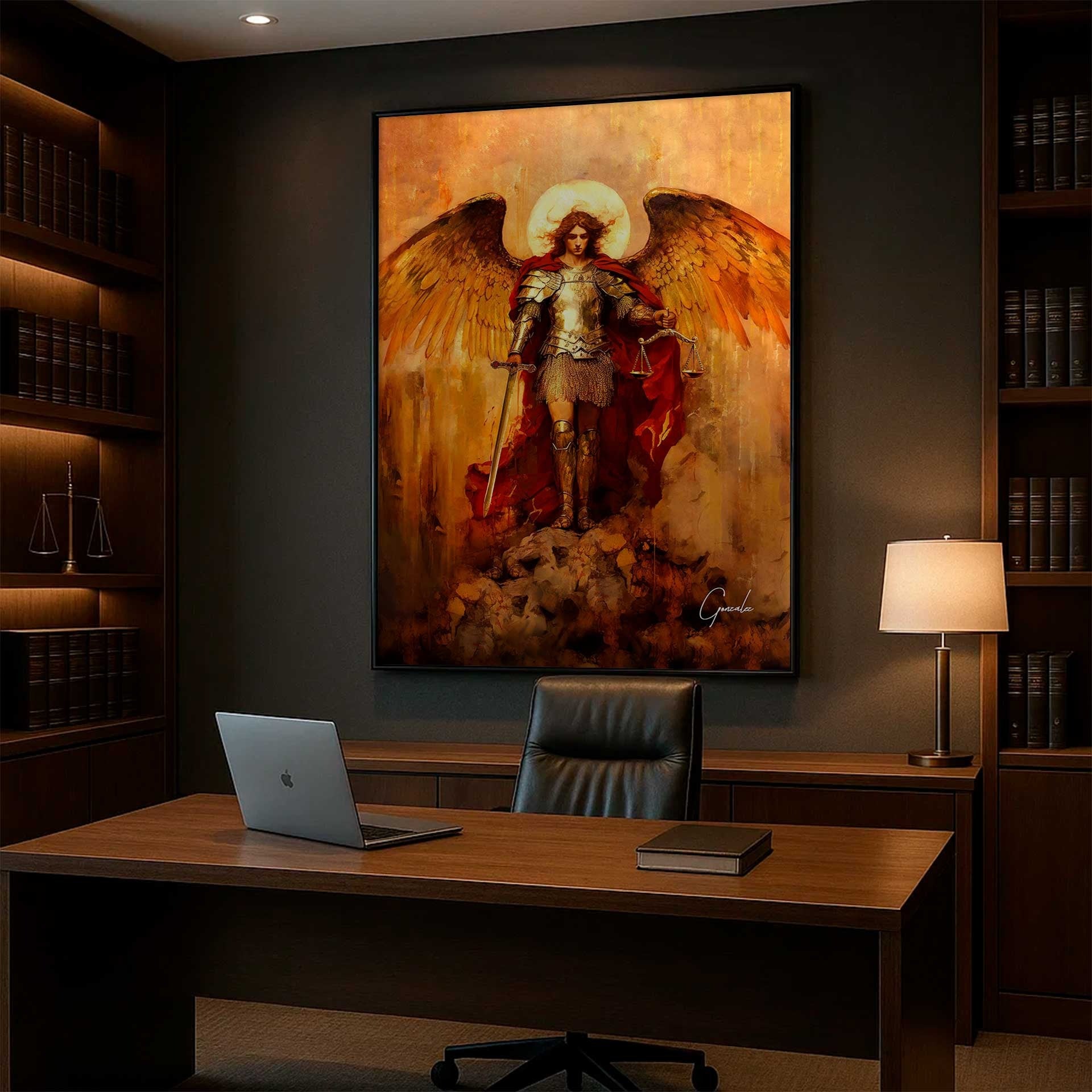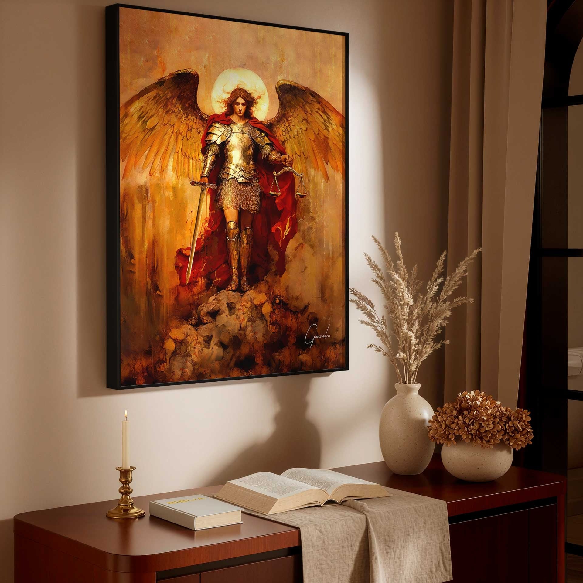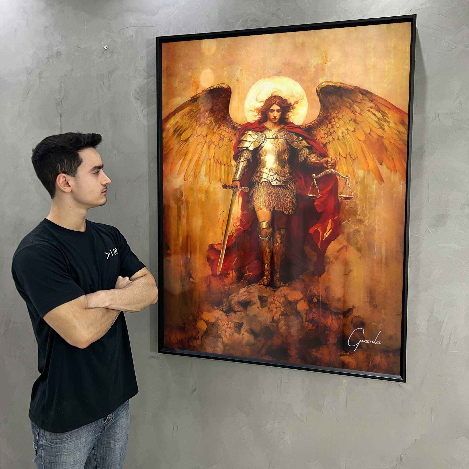 The archangel’s commanding stance, combined with vibrant tones of gold, orange, yellow, and the striking red of his cloak, creates a dazzling visual palette that highlights not only divine strength but also the intensity of the spiritual battle led by Saint Michael the Archangel. Every meticulously crafted detail in the Strati D’Art technique enriches the interpretation of the angelic figure, evoking a transcendent presence while maintaining remarkable aesthetic sophistication. A true masterpiece that illuminates and inspires, standing out as a sublime representation of spirituality expressed through art.