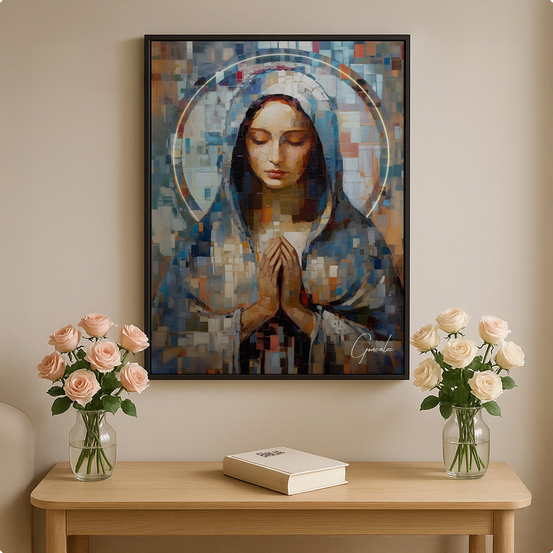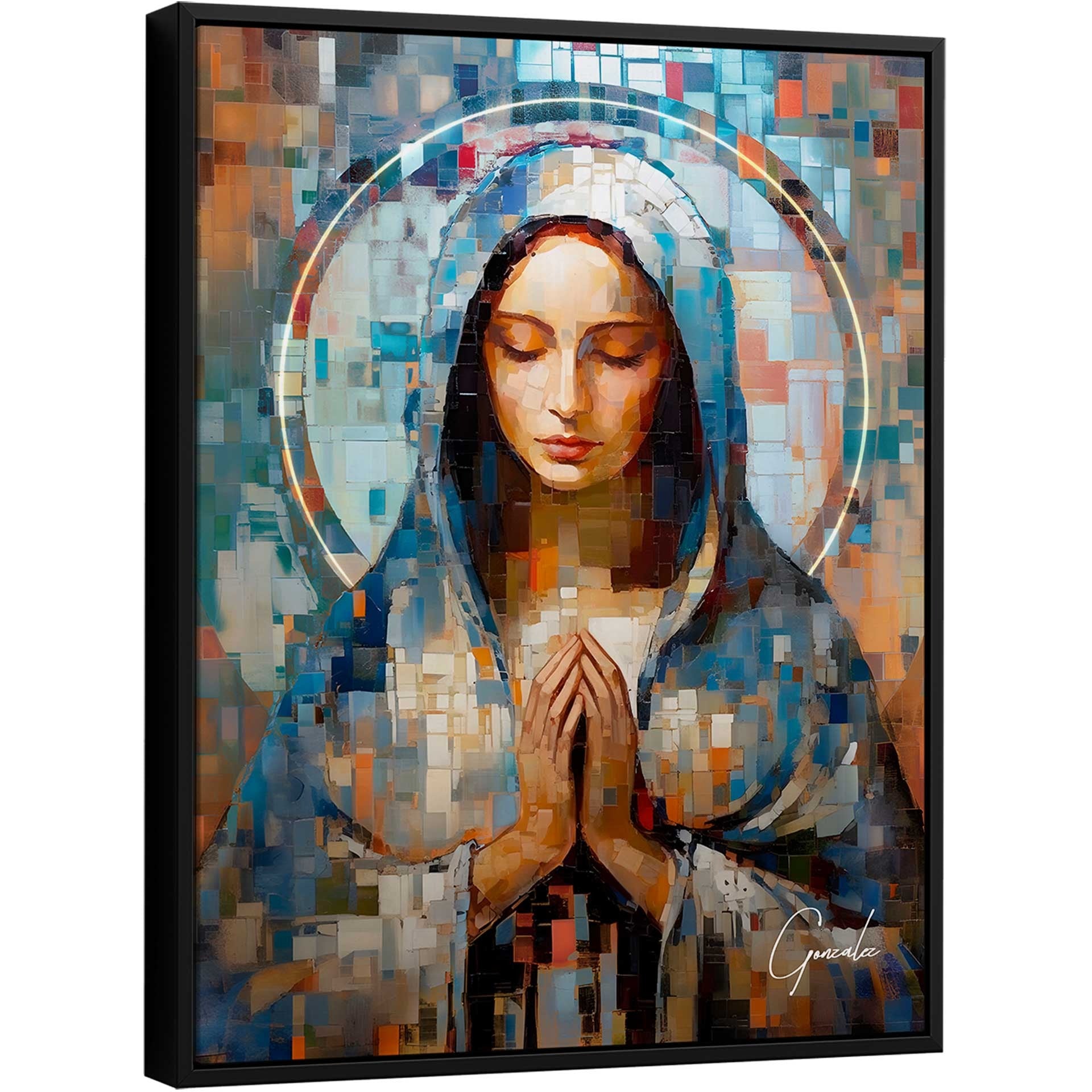 This striking artistic piece portrays Mary in a posture of prayer, conveying serenity and devotion through the intercession of the Heavenly Mother on our behalf. The Grid Art style is composed of small squares, meticulously created through the artist Gonzalez’s careful and deliberate manipulation of form. A creation that elevates his work to a higher artistic level, each detail of this inspiring piece represents the power of faith and the pursuit of divine connection. The squares form an intricate pattern that adds depth and texture to Mary’s image, while the vibrant colors and the artwork’s divine aura create a sense of contemplation and inspiration. This painting is the perfect piece to bring Mary’s presence into your home and daily life, serving as a constant reminder that even when you feel alone, she is always by your side.